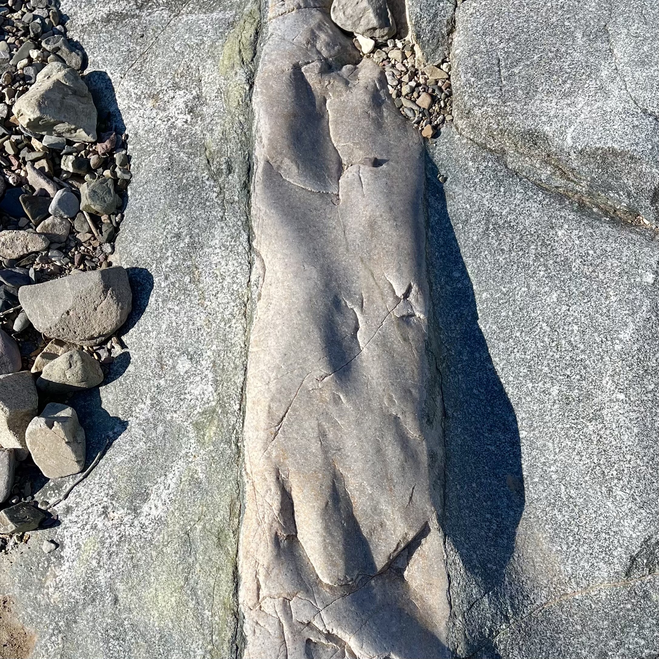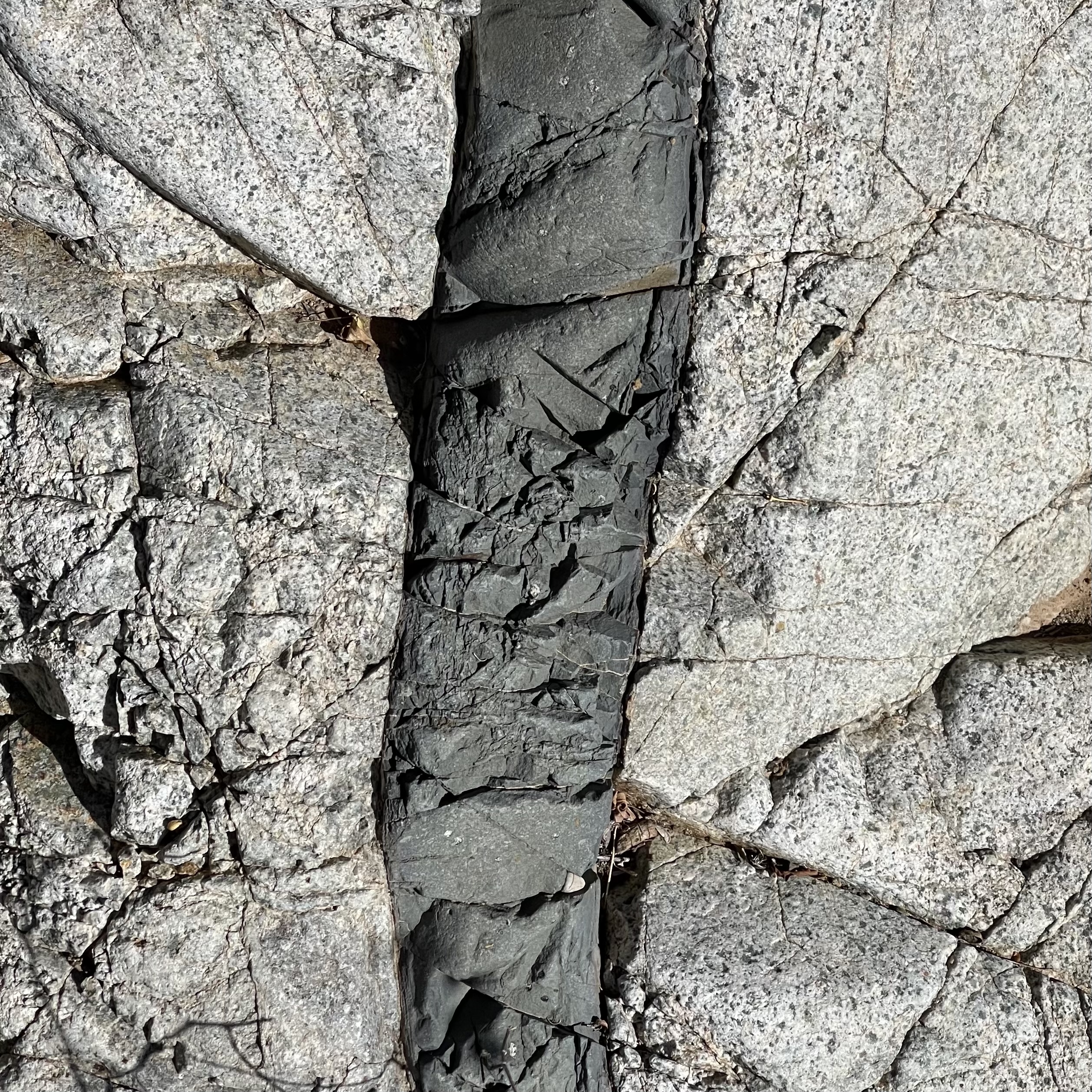 A white aplite vein in gray granodiorite looks like pale sand below high dark stone.