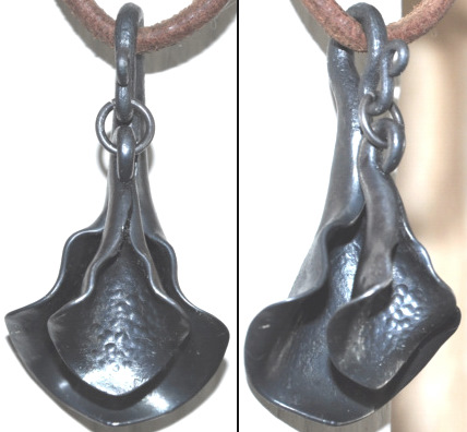 Pendant or amulet, 2 1/4″ long, with two nesting pointed cones. Smaller cone has been given a dimpled bur texture on the inside. Forged from two triangles of 1/8″ mild steel plate, with black steel wire ring. With only two of them (one very small), they are primarily decorative and hardly qualify as bells, but they do make a small clinking sound.
