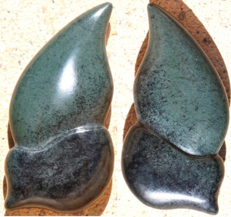 Green Cat Claw. A bluish-green to black mixture of fine-grained nephrite jade and coarse-grained amphibolite with minor serpentine and microscopic magnetite octahedra. This odd stone comes from Victorville, CA in the Mojave Desert and is not a typical California jade. Strictly speaking, the coarser-grained dark material isn’t “jade” at all, though the mineralogy is the same. Unpredictable and extremely challenging to carve and polish. The claw is exactly two inches long. I chose the shape because I wanted to make maximum use of the material and to emphasize the color and grain size differences. A nice pocket rock!