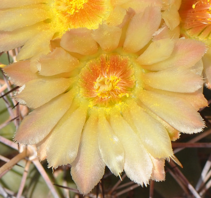 Five days after the first significant summer rain…you can count on that to be Bloom Day for Coryphantha robustispina, the Pima Pineapple Cactus. For me, this event captures the bright, ephemeral essence of summer, with dozens of sunlike flowers peering out of the spines. The yellow flowers are slightly fluorescent and have a nearly metallic luster that creates a soft glow over the land, especially since Bloom Day is usually humid and partly cloudy, with restless monsoon clouds and the occasional rumble of thunder over the mountains. Yesterday was the biggest bloom, but a few plants have small flowerbuds that will probably open after the next rain.