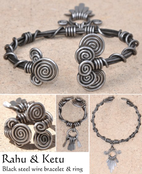 We are remodeling my blacksmithing work area to add perforated steel screens and a security door, and it won’t be finished for another week or so. The rest of my shop is usable, so I’ve been making black steel wire jewelry to help rebuild the strength in my hands, since I still have some lingering neuropathy after January’s mystery virus. I put a few inexpensive pieces on the website today. Below is a set that I plan to keep and wear. They are “torc style” but with odd terminals: Rahu and Ketu, named for the “head and tail” of the celestial Dragon, the North and South Nodes in astrology. Since the New World “dragon” is a feathered serpent, I’ve added a token fringed dangling ornament to each piece. The BRACELET is four strands of 14-gauge wire, wrapped with a fifth strand. The RING is two strands of 15-gauge wire wrapped with a third strand. I also made a seven-strand torc with the same motif, but it’s not polished yet and isn’t as nicely proportioned as the bracelet, so I’m not sure what I’ll do with it, if anything.