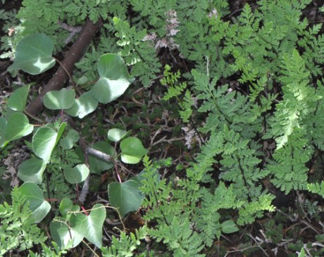 Lammas – the solar cross-quarter holiday that marks the halfway point between the Summer Solstice and the Autumn Equinox – also marks the transition to early autumn, and the eight-week period that I named “Gathering the Sun” many years ago. We celebrated with a hike in the saguaro forest in the Rincon Mountains, listening to the trickling water that poured everywhere down steep canyons and tiny outcrops after yesterday’s heavy thunderstorms. One of my favorite shrubs, Jatropha cardiophylla (Sangre de Drago or Limberbush) was in full leaf and flower. This is a Sonoran Desert shrub that reaches the eastern edge of its range in the Rincon and Empire Mountains. The sprays of thick, reddish brown twigs stand dormant for nine months, but with summer rains they grow shiny green heart-shaped leaves and tiny white urn-shaped flowers. The picture below looks like a woodland scene, but it is really in saguaro desert. The desert fern Cheilanthes wrightii is growing with a dryland spikemoss, Selaginella arizonica, in the shade of Jatropha cardiophylla (leaves on left side of photo).