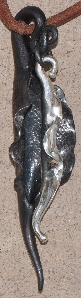 Pendant with two nesting pods, 3.5 inches long. The larger one is steel, forged from a cut nail, with dotted bur-textured interior. The black finish has been slightly polished on the inside wavy edges to reveal the shining dark gray iron underneath. The smaller pod is sterling silver, forged from heavy 6-gauge wire. It has a bright, smooth polish and moves freely on its black steel wire ring. When worn, these double pod pendants move slightly and make a slight rattling sound. Black steel wire ring was chosen for minimal contrast but can be replaced with a copper or silver ring upon request.