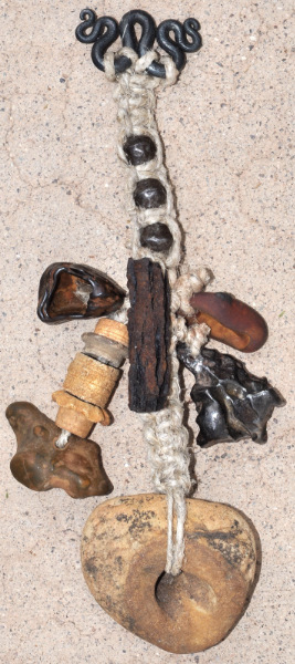 Forged iron hook, hemp cord, antique African iron beads, and sacred pebbles. Pebbles were collected in 1988-1992 from various eastern Kentucky creeks except where noted.