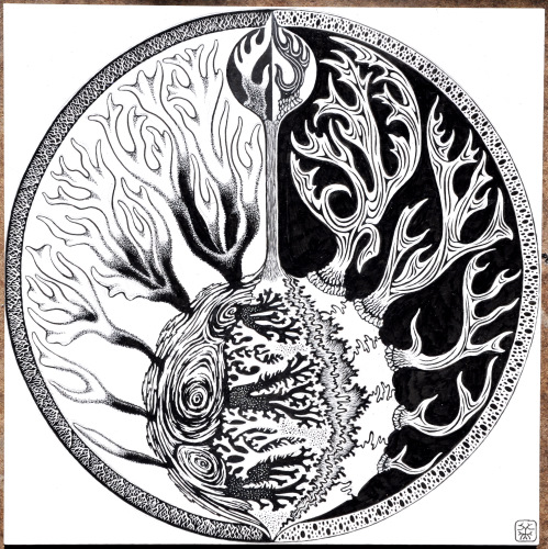 This antler drawing that I finished several months ago is also appropriate for the Third Quarter Moon before the Winter Solstice. The left side shows the Carbon Antler Fungus, Xylaria hypoxylon, growing on knotty wood. The right side shows stylized whitetail deer antlers and the top of the deer’s skull, including sutures. Uniting the two images are the intricately interlocked branches of Pseudevernia consocians, an antler-like lichen that grows on tree branches. The circle at the top shows the fungus and antler in reverse colors, drawn extremely stylized to resemble hands. The rim on the left shows the fungus mycelium (network of threads that fills the rotting wood on which it grows) and the rim on the right shows the porous bony pattern of an antler in cross-section. (Both drawings are on 6″ scratchboard.)