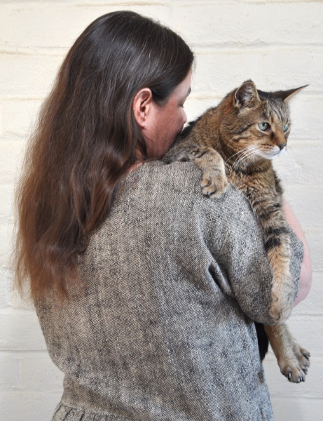 Tabby is our oldest cat, and the one we’ve had for the longest time. He was a stray that we took in when we lived in Versailles, Kentucky. I first saw him in November 1994 when he took refuge in our backyard shed. He was very friendly and already neutered, so I assumed that this big handsome cat was someone’s pet. He looked to be about 18 months old. I found out that he belonged to a neighbor whose daughter adopted him as a kitten, quickly grew tired of him, and gave him to her mother. The mother didn’t like him because he didn’t match her two gray and white cats, so she dumped him outside. He kept visiting our apartment and the two other rentals in the house, and we all fed him. Finally the neighbor denied ownership and we were able to bring him into our family in August 1998. I have arbitrarily assigned his birthday to January 1993; this is a minimum age, since he was full grown when we met him. So he’s 19 this year, in excellent health (with all his teeth!) and still the same active, friendly cat who loves everyone, although he’s got darkening “old man eyes” and I think feline dementia has begun to set in, since he consistently yowls at his water bowl for several minutes before drinking. Here’s a photo of me holding him in January 2002.